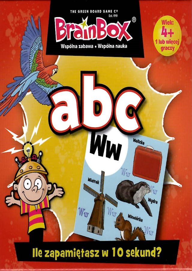 BrainBox : ABC. - Gdańsk : Rebel, [2021]. - 1 gra (55 kart, 1 karta z zasadami, klepsydra, kostka) : plastik, tektura, kolor ; w pudełku 12x12x12 cm.